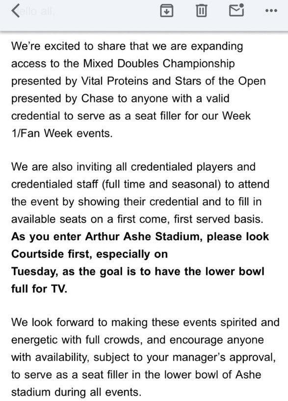 记者Ben Rothenberg晒出邮件截图,邮件中美国网球协会邀请所有持证人士(球员和工作人员)去填补空座,以免电视转播时出现空座。